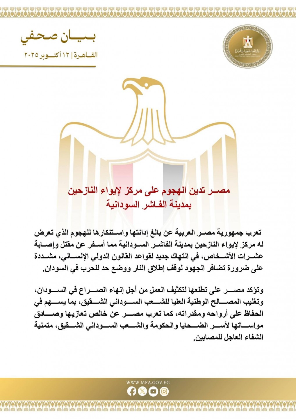 مصــر تدين الهجوم على مركز لإيواء النازحين بمدينة الفـاشر السودانية