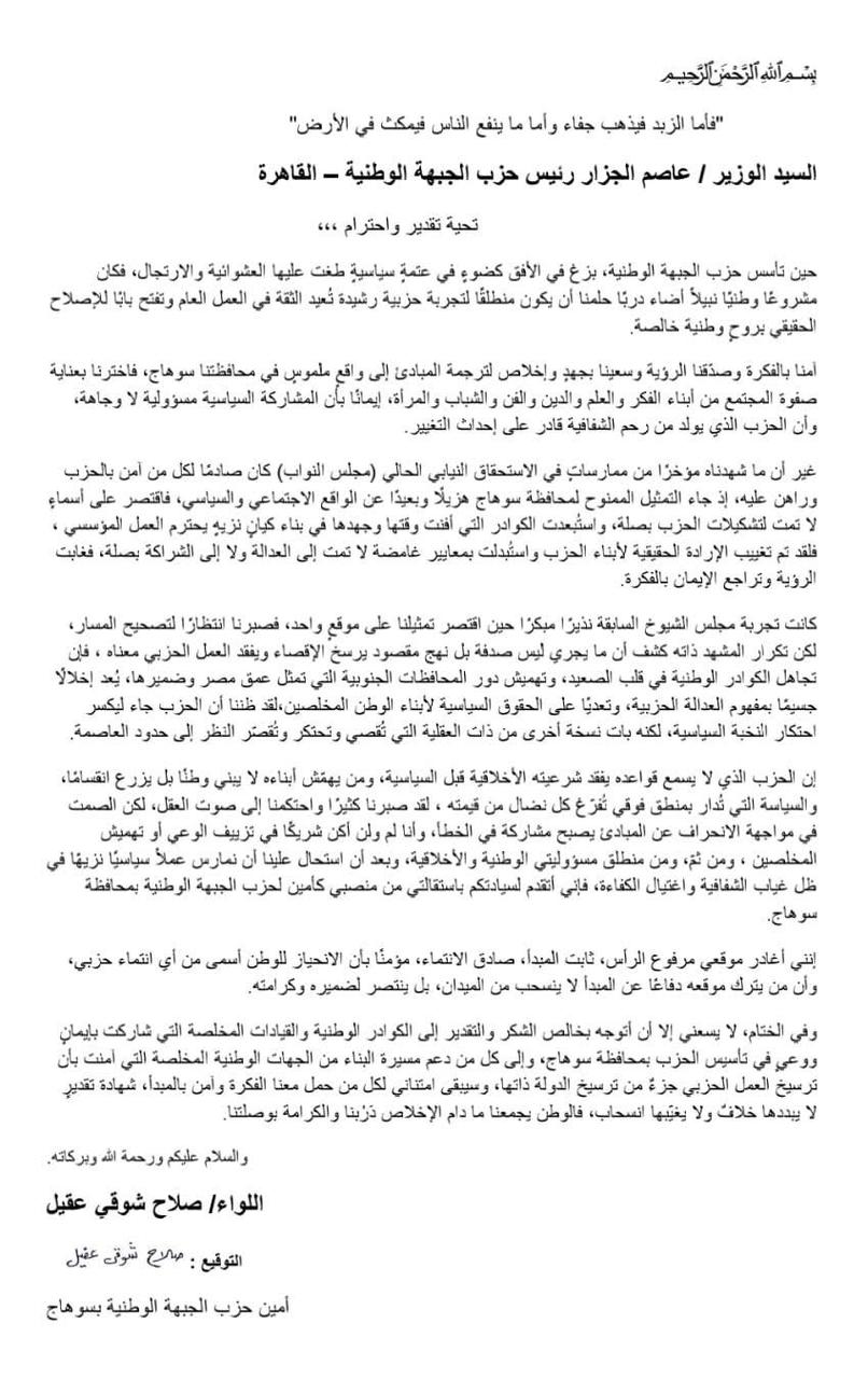إن الحزب الذي لا يرسخ قواعده وفق شرعة الأخلاق قبل السياسة، ومن يُشيَّد كيانه لا يبنيه، ومَن يُقصي أعمدته، والسياسة التي تُدار من منطلقٍ فرديٍ تفرغ كل نضالٍ من قيمته، فهكذا صرنا. كنا نطمح أن نصمت احترامًا للحلم، لكن الصمت اليوم لم يعد يعني الرضا بقدر ما يعني خيانةً للأمانة. وإننا إذ نؤكد أننا لا نهدف سوى لتصحيح المسار من منطلق مسؤولياتنا الوطنية والأخلاقية، وحتى لا يتحول الحلم إلى عبءٍ سياسيٍ نتحمله في ظل غياب الشفافية وإعلاء الكفاءة، فإنني أتقدم أمامكم باستقالتي من منصبي أمينًا لحزب الجبهة الوطنية بمحافظة سوهاج.
