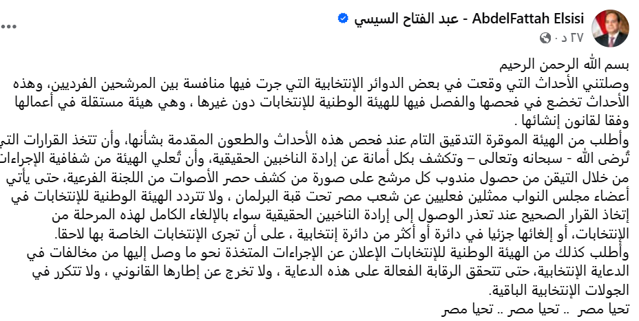 أصدر الرئيس عبد الفتاح السيسي منشورًا عبر صفحته الرسمية على موقع فيسبوك، علّق فيه على ما تم تداوله بشأن بعض الأحداث التي شهدتها دوائر انتخابية خلال منافسات المرشحين الفرديين، مؤكدًا أهمية دور الهيئة الوطنية للانتخابات في فحص الوقائع والطعون وتحقيق أعلى درجات الشفافية وصون إرادة الناخبين.