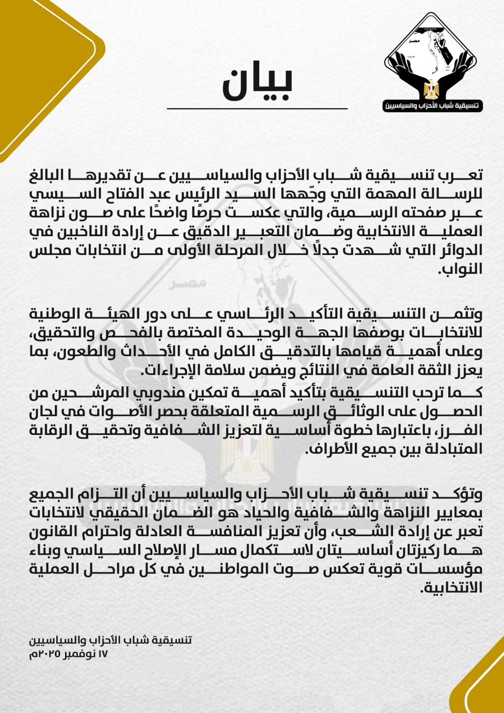 تعرب تنسيقية شباب الأحزاب والسياسيين عن تقديرها البالغ للرسالة المهمة التي وجّهها السيد الرئيس عبد الفتاح السيسي عبر صفحته الرسمية، والتي عكست حرصًا واضحًا على صون نزاهة العملية الانتخابية وضمان التعبير الدقيق عن إرادة الناخبين في الدوائر التي شهدت جدلًا خلال المرحلة الأولى من انتخابات مجلس النواب.
