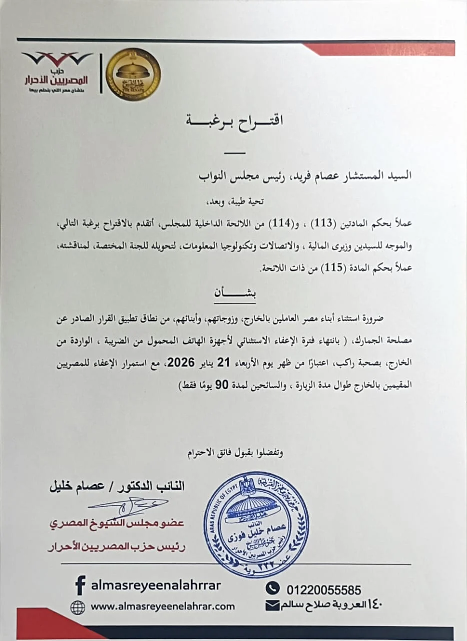 تقدم النائب الدكتور عصام خليل، عضو مجلس الشيوخ ورئيس حزب المصريين الأحرار، باقتراح برغبة إلى المستشار عصام فريد، رئيس مجلس النواب، يطالب فيه باستثناء أبناء مصر العاملين بالخارج وزوجاتهم وأبنائهم من قرار مصلحة الجمارك الأخير بشأن إنهاء الإعفاء الاستثنائي لأجهزة الهاتف المحمول الواردة بصحبة الركاب.